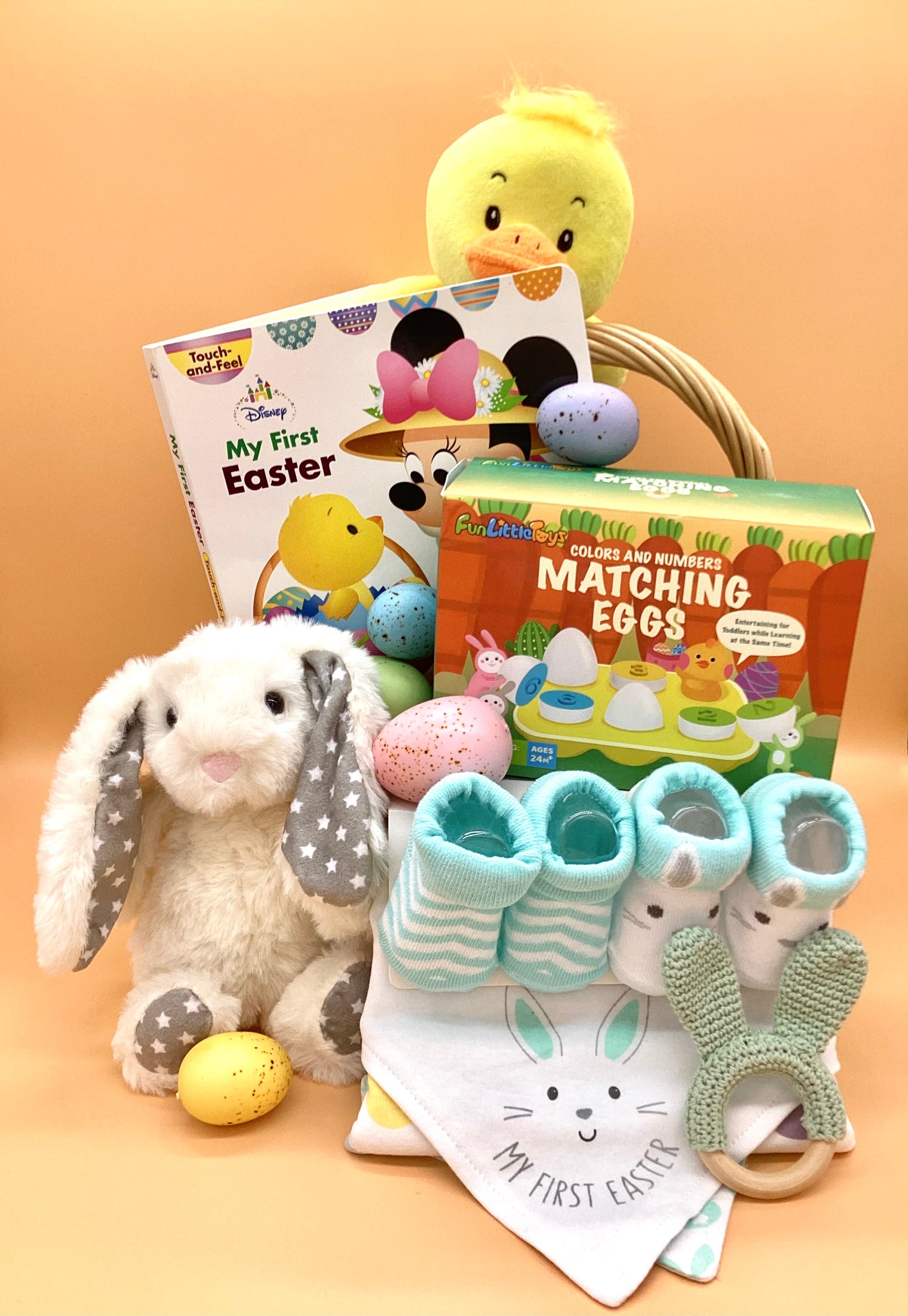 The Baby's 1st Easter Gift Basket is the perfect gift to celebrate the new baby and their first Easter. This willow basket includes the following items: