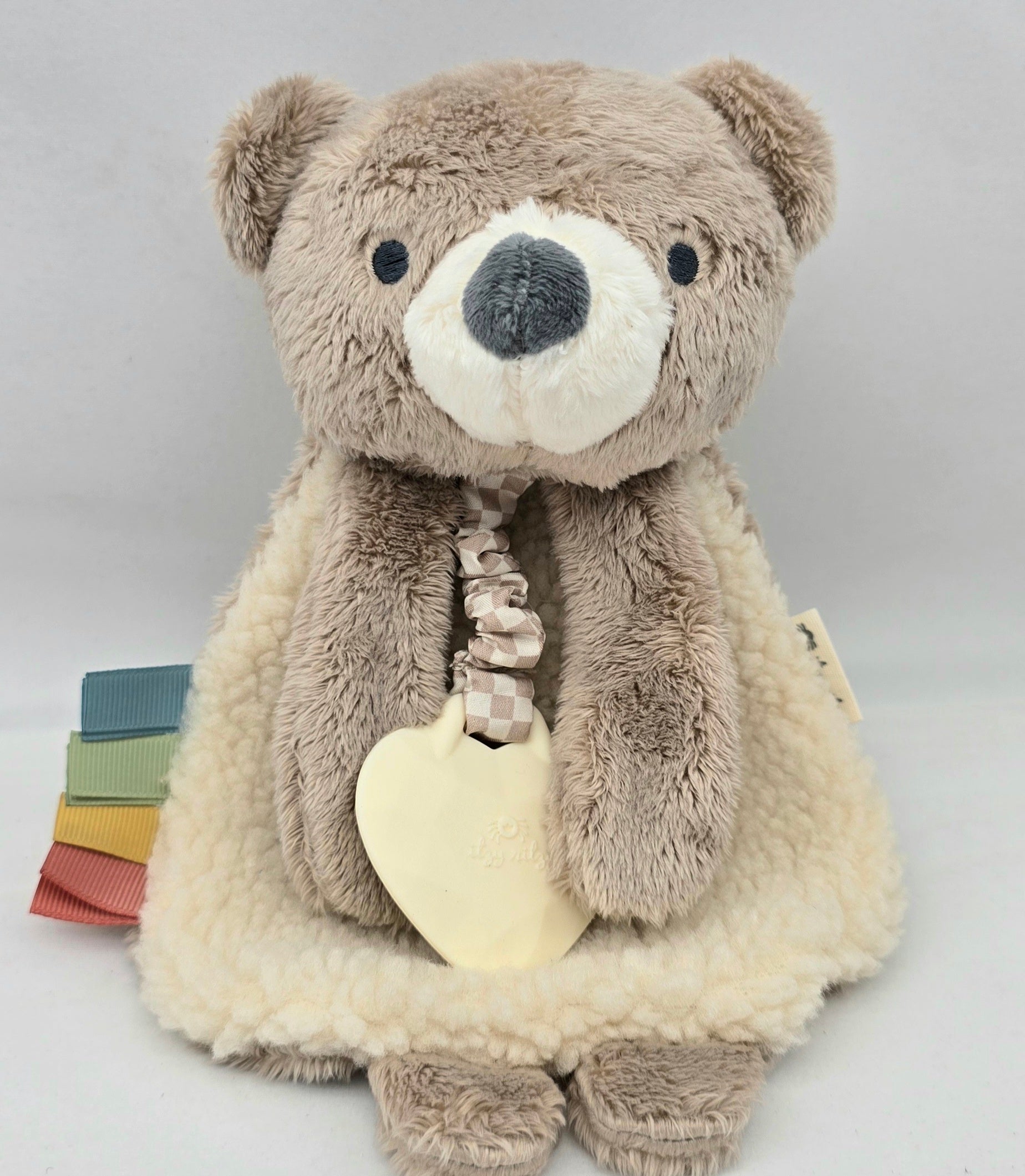 9" teddy bear lovey with soft sherpa fabric, crinkly legs and arms, and textured ribbons